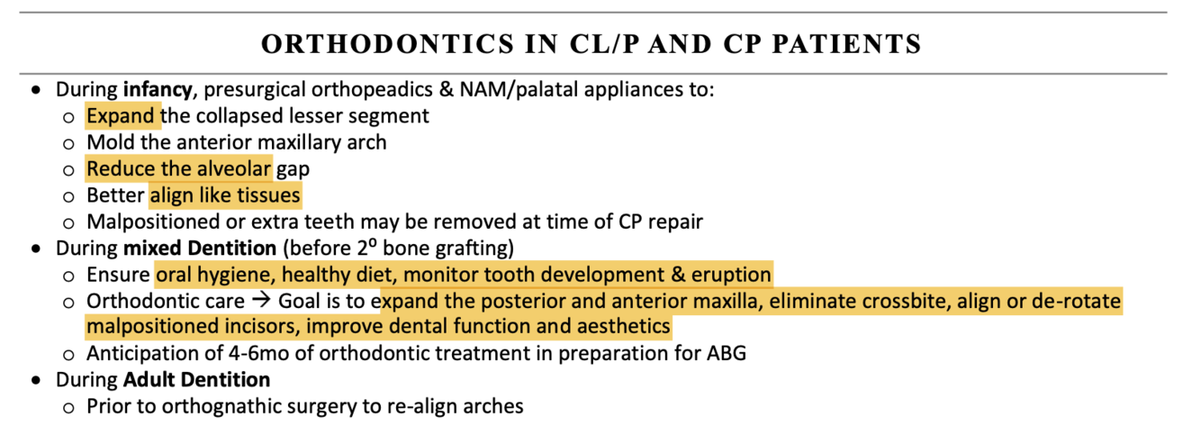 What is the purpose of presurgical orthodontics in infancy, mixed, adulthood.