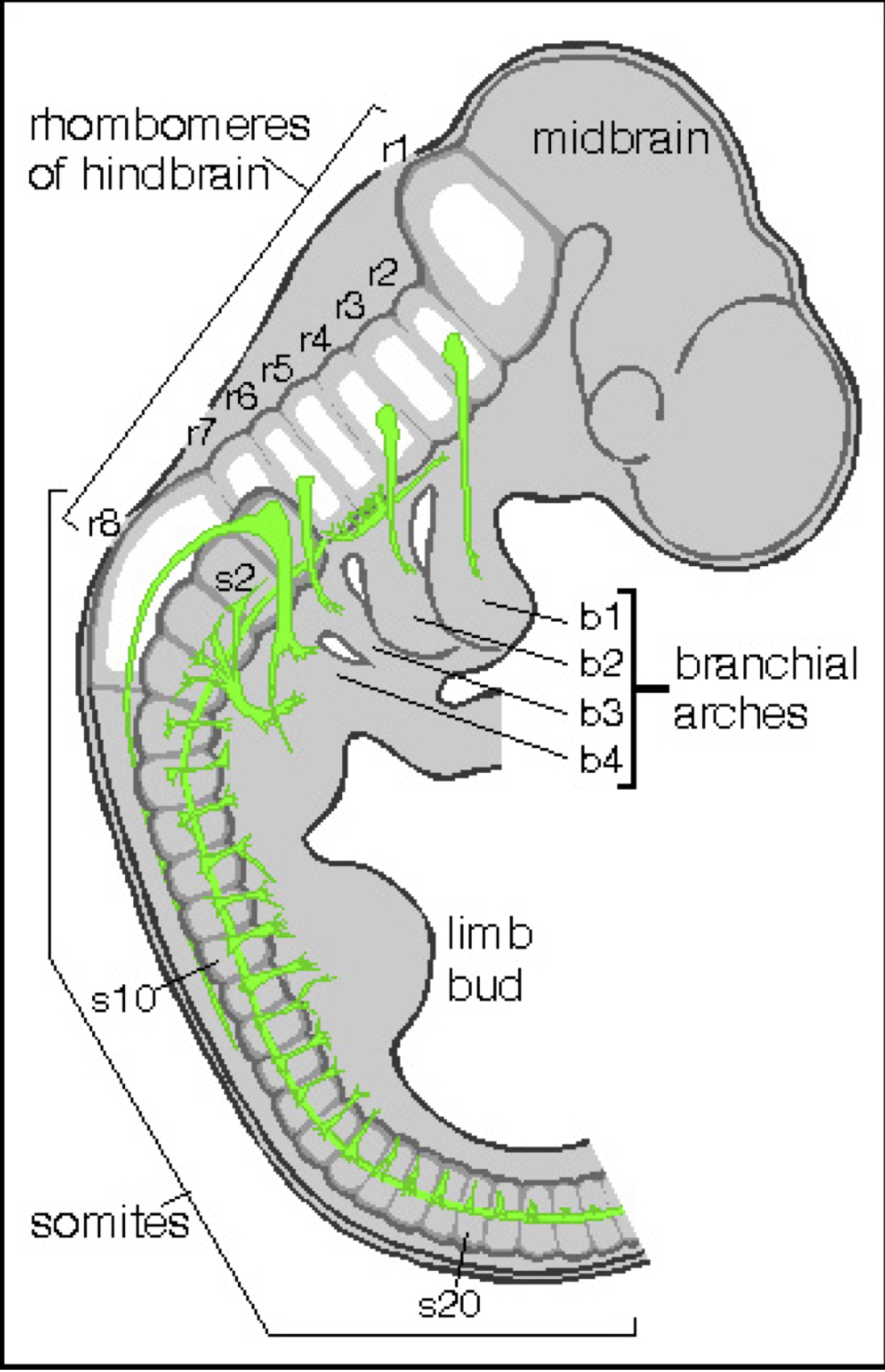 The part of the neural tube that develops behind the rhombencephalon (hindbrain) develops a series of bulges ⇒ rhombomeres.
