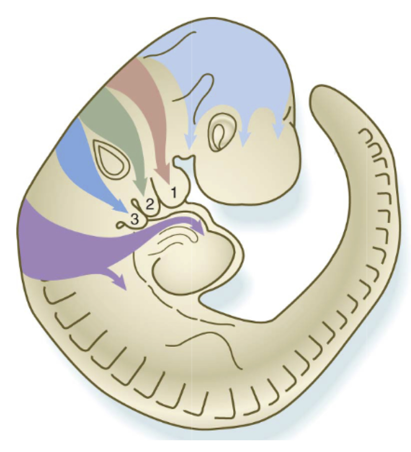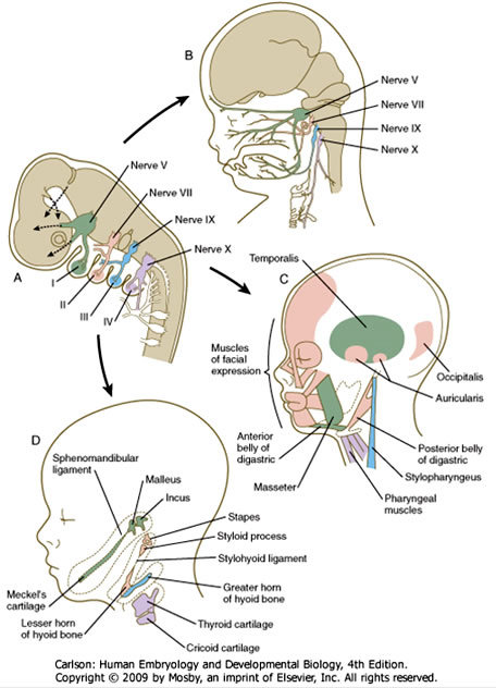 1st pharyngeal arch: rhombomeres 1, 2, and 3