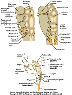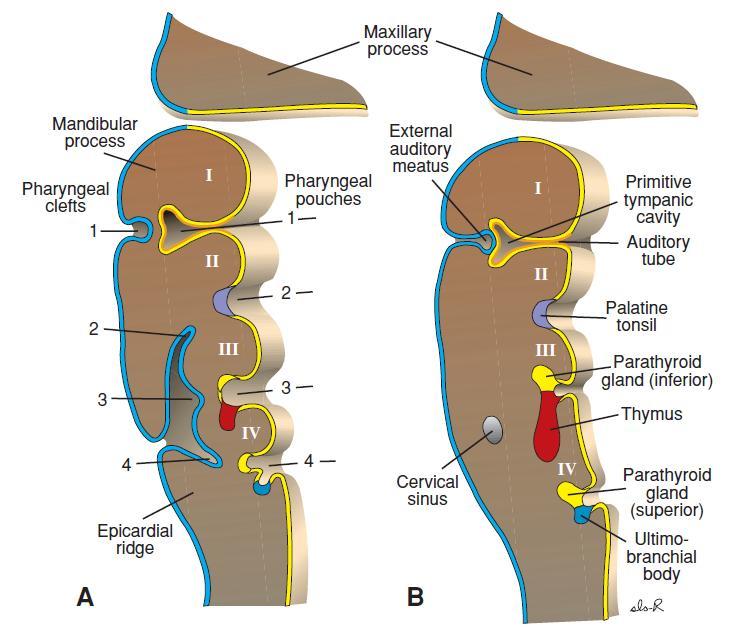 Neural crest cells associated with specific rhombomeres migrate into the ventrolateral aspect forming the pharyngeal arches.