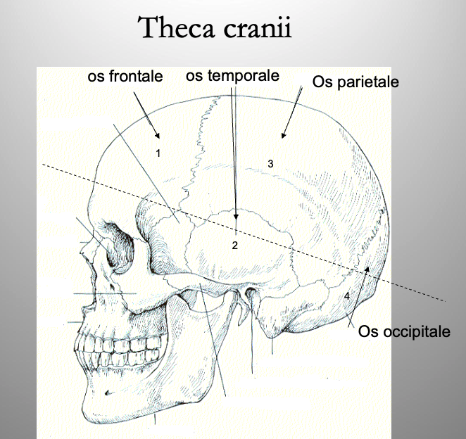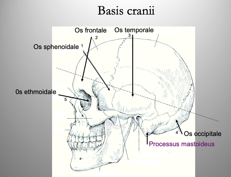 Når man kigger ned i basis cranii (minus theca cranii) inddelses fladerne i: