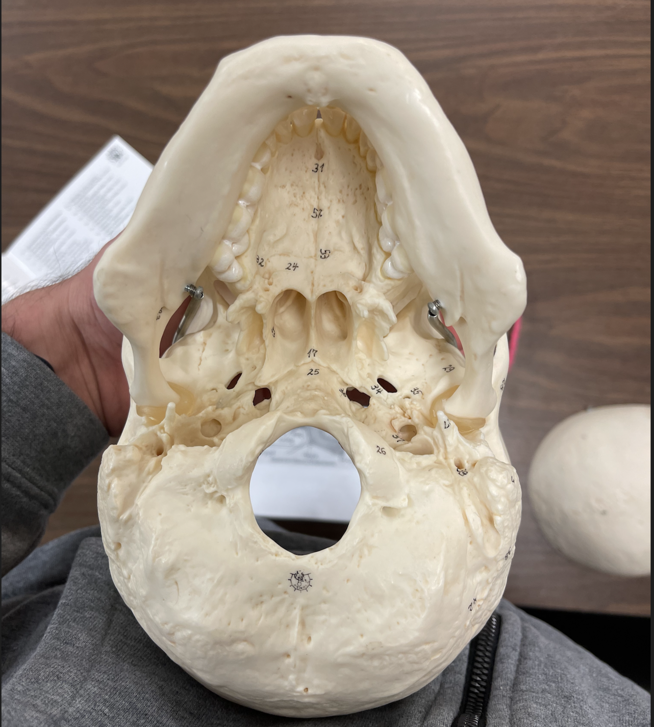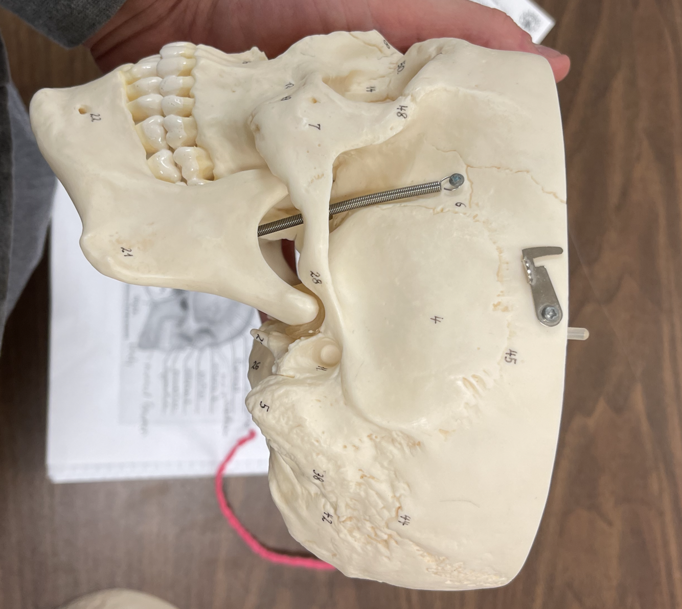 6-pterion region/ala magna 4-temporal 45-sqaumous suture 44-paretomastod suture 42-occipitomastod suture 38-mastoid foramen 5-mastoid process 21-mandible angle 22-mental foramen 7- zygomatic 48-zygomaticfrontal suture 14-lacrimal 50-frontomaxilla suture ext auditory canal also present