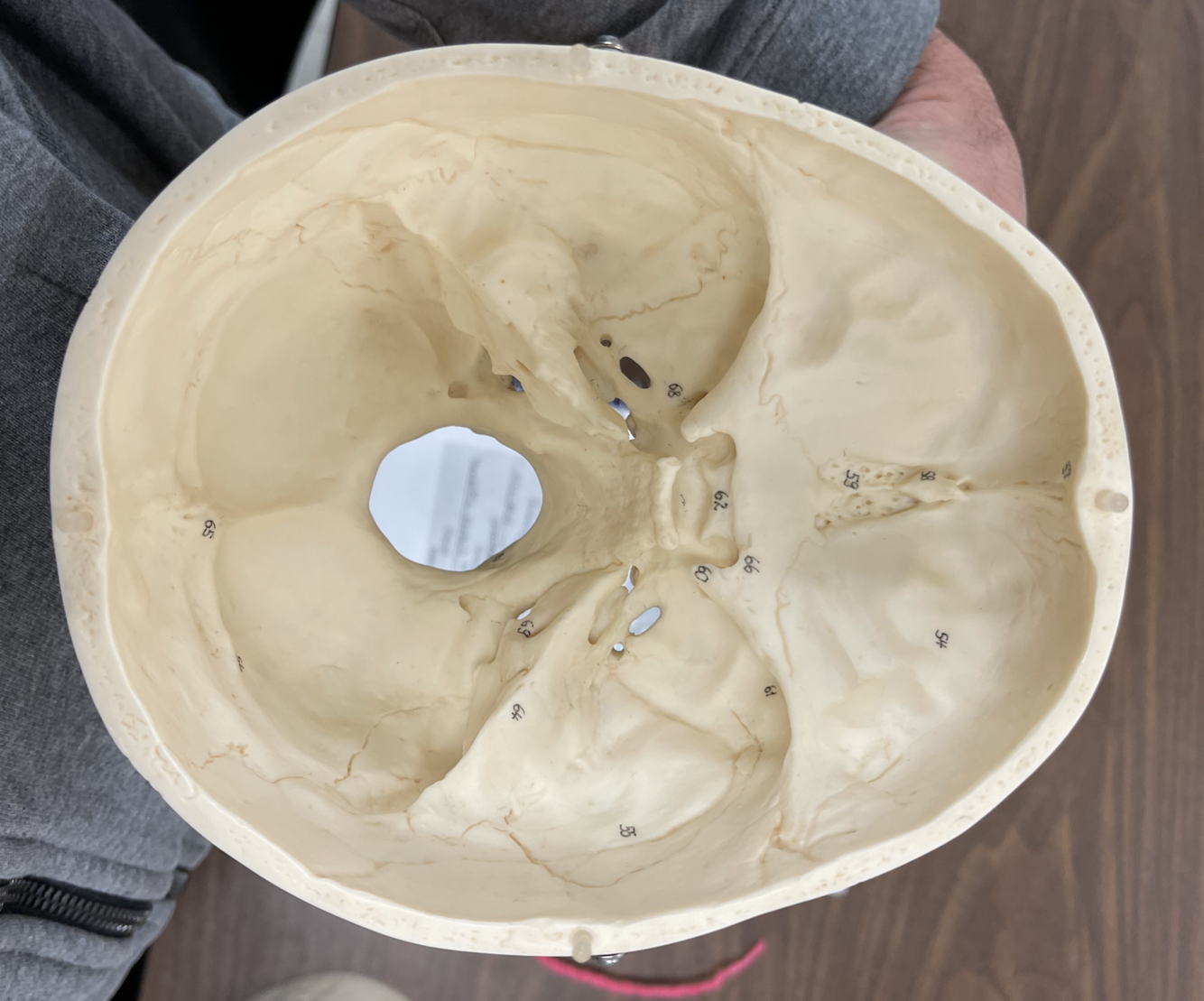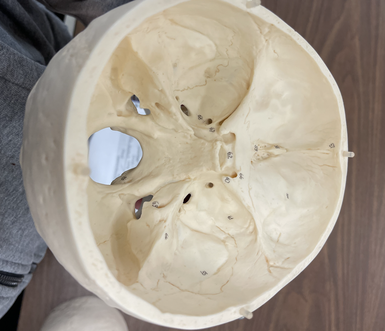 58-crita galli 59-cribiform plate 54-anterior cranial fossa 68-foramne rotundum 62-sella turcica 61-ala magna 69-int acoustic meatus 55-middle cranial fossa 65-occipital protuberence 66-optic canal 60-ala pava