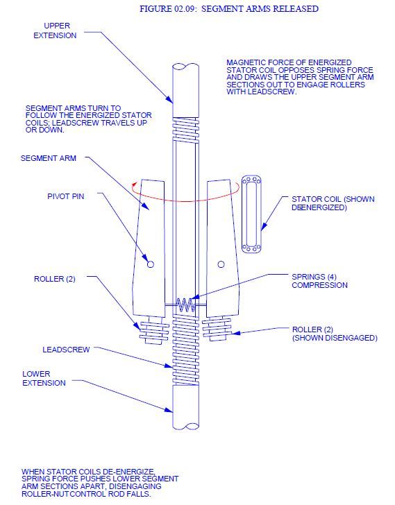 The segment arms are magnetically powered to engage the segment arms, overcoming spring pressure. When the CRD is energized the segment arms engage the roller nuts (4 per rod) and allow movement of the control rod. Once the rod is de-energized by a RX trip, the segment arms are no longer magnetically held and the spring pressure disengages the segment arms from the roller nuts and allows the rod to drop.
