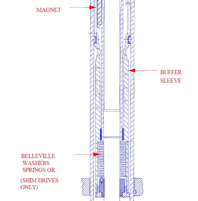 The buffer (snubber) assembly design limits the shock initially and belleville washers absorb the remaining energy.