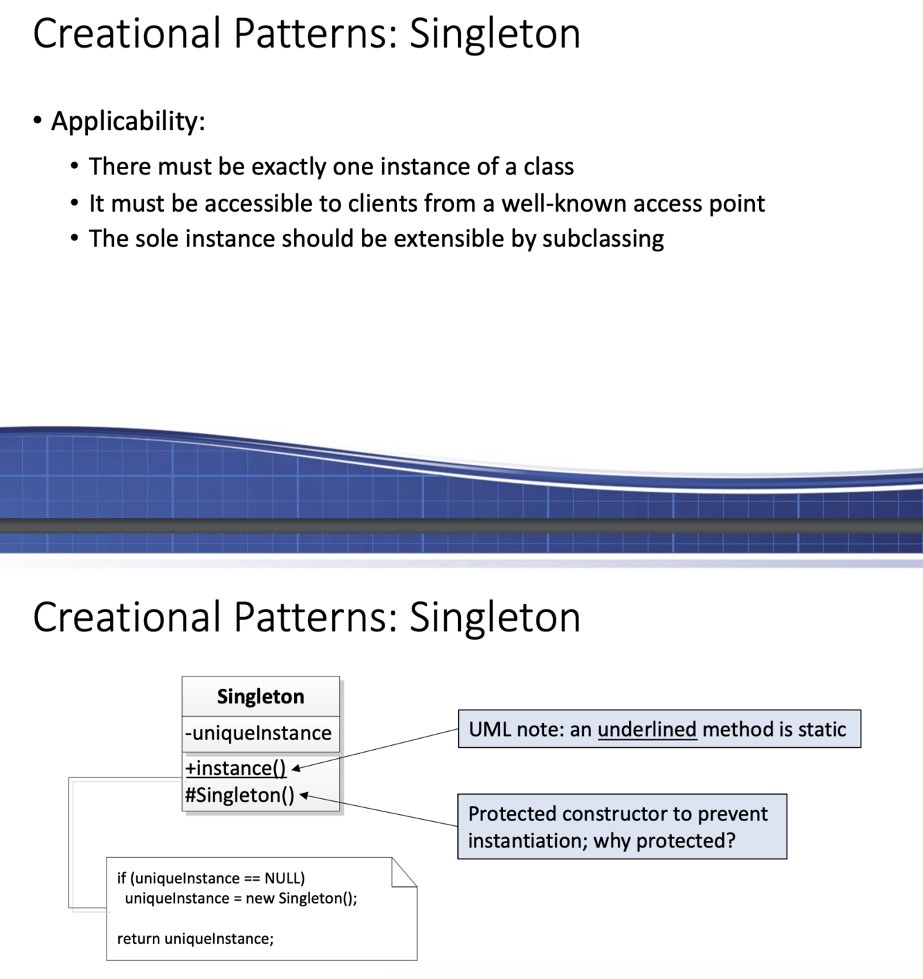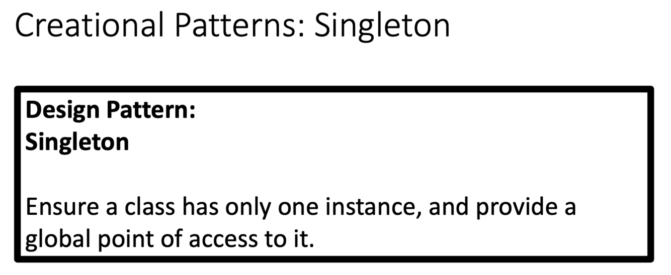 Go through the logger example of the Singleton design pattern in the slides