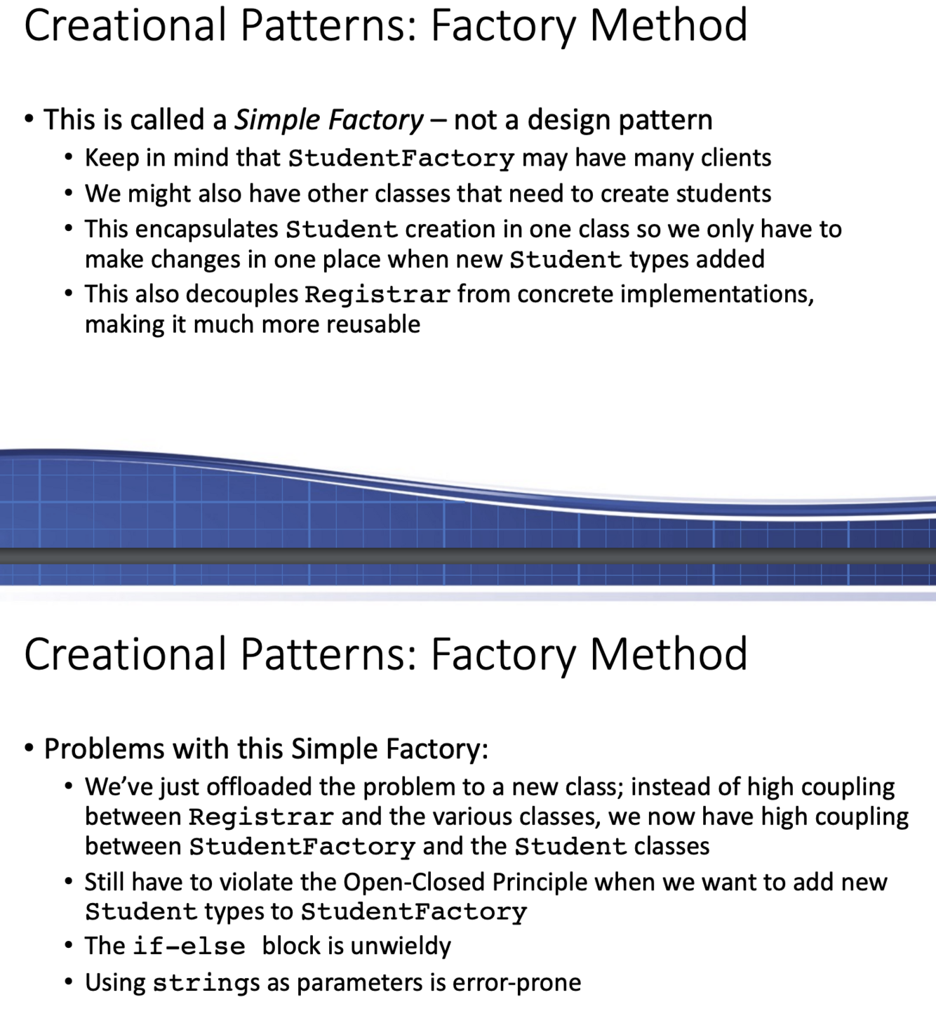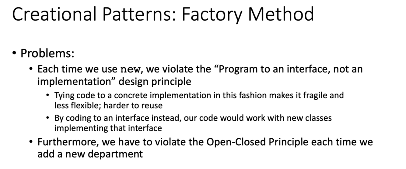 What are the problems withe the factory method creational design pattern?