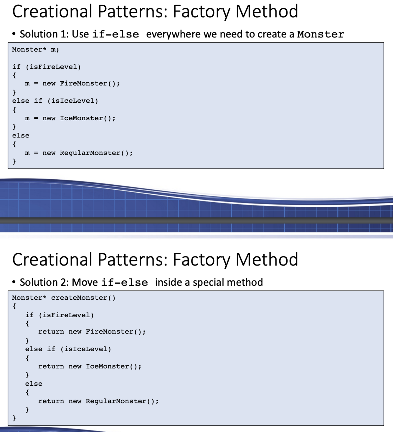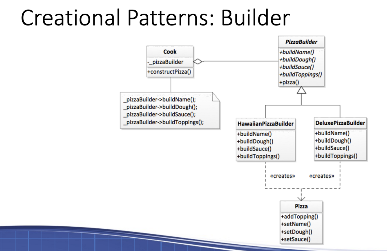 Go over the Pizza Pizza example for the creational design pattern: