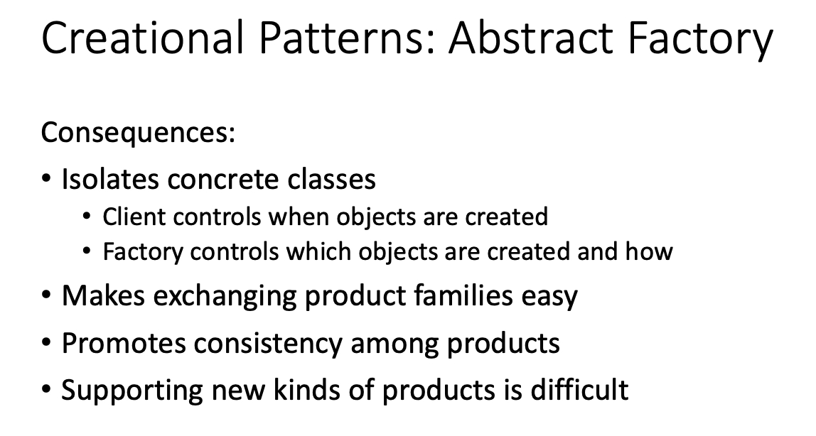 What are the consequences of the abstract factory creational design pattern?