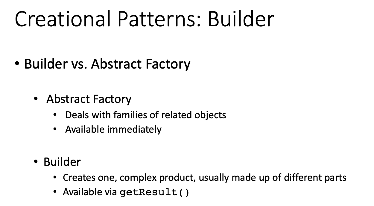 What are the differences between the builder creational design pattern and the abstract factory creational design pattern?