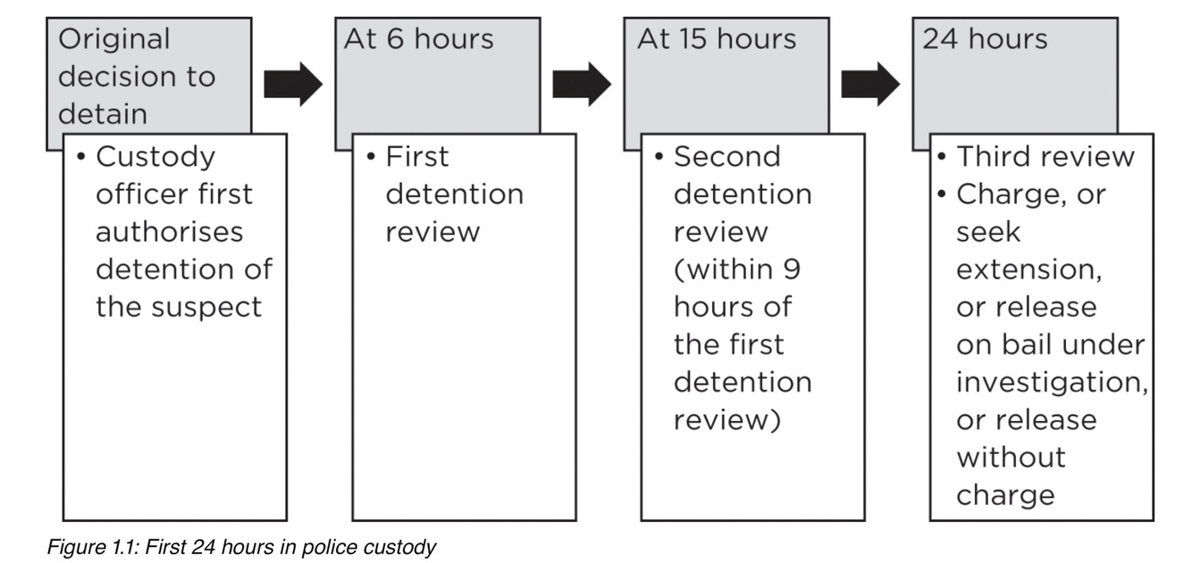 A detention review is where an officer of at least the rank of inspector determines whether a suspect continued detention is justified. The review clock starts when the detention is authorised.