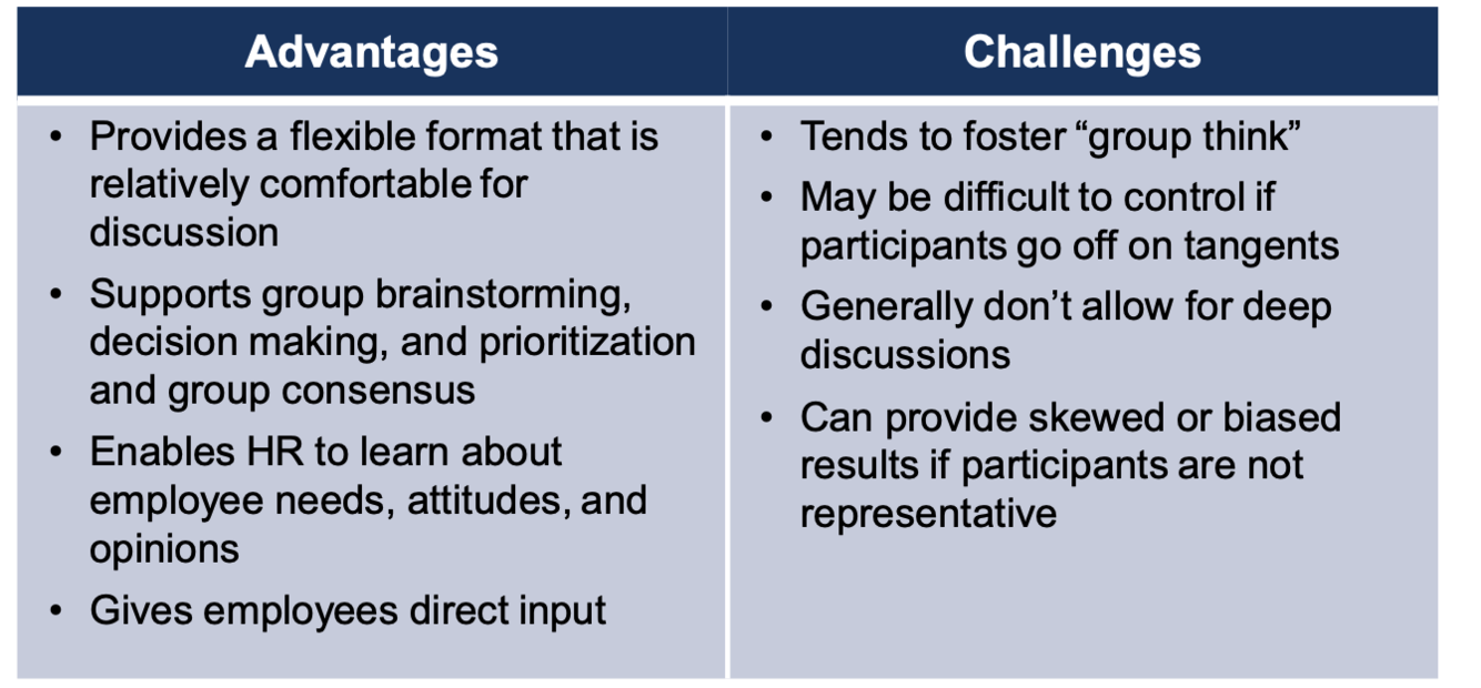 Small group of invited persons (typically six to twelve) who actively participate in a structured discussion, led by a facilitator, for the purpose of eliciting their input.