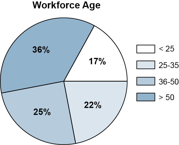 Graphically depicts as portions or slices of a circle the constituents that comprise 100% of a data group. Textual data information can be included in callouts or in an attached table for more precise communication.
