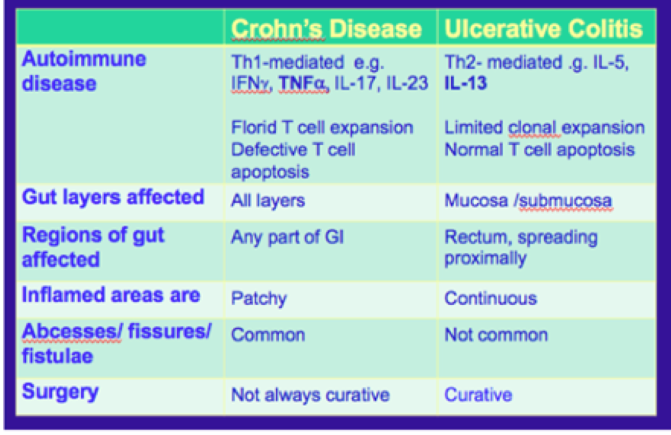 Th1 mediated, with main cytokine being TNF-a. As it is Th1-mediated, causes more severe inflammatory response which can penetrate all the way through the gut and affect any point of GI tract from mouth to anus.
