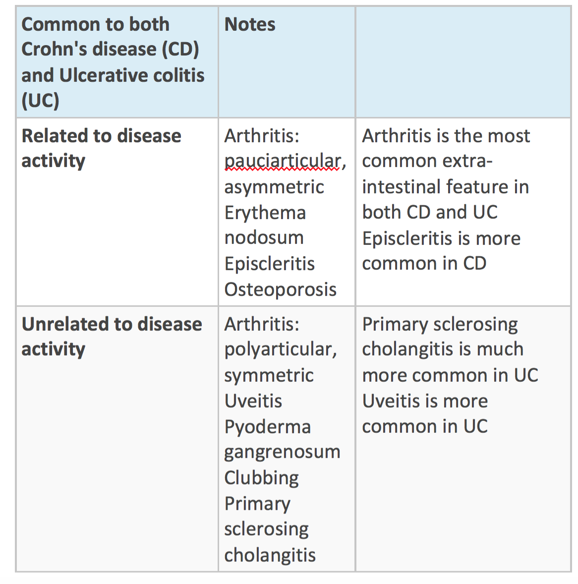 APIESAC: Aphthous ulcers, pyoderma gangrenosum, iritis, erythema nodosum, sacroilitis (back pain), arthritis, clubbing