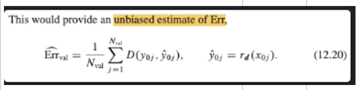 “We want to estimate the true error - but using the apparent error is biased because the prediciotn rule has been adjusted to fit the observed responses (overfitting). Instead, we introduce a validation set with unseen data to provide an unbiased estimate of Err: