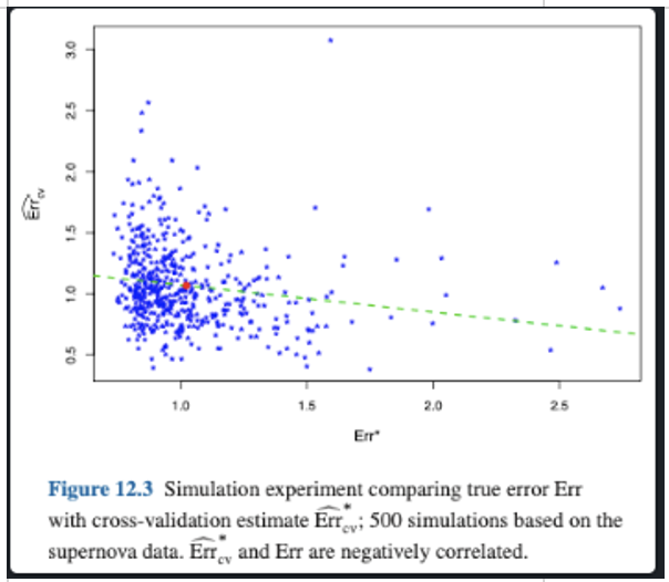 Simulation using a true error reveals that there is a negative correlation between CV-error and true error. Large values of CV-err go with smaller values of true pred. error and vice versa.