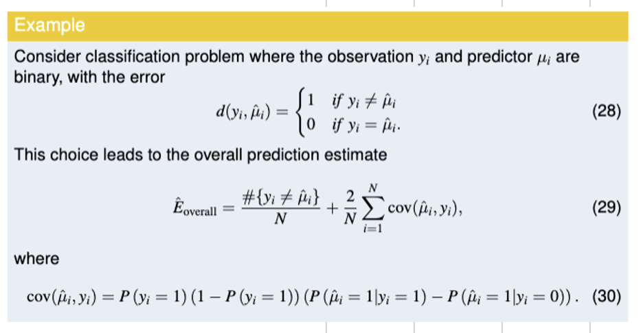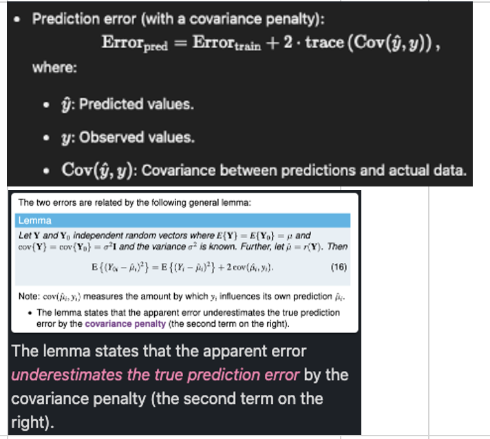 Covariance penalties account for the overfitting by incorporating the dependence between the data used for fitting and the predictions.”