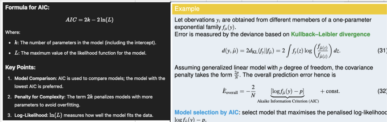 The Akaike Information Criterion (AIC) is a measure used for model selection in statistics. It quantifies the trade-off between the goodness of fit of a statistical model and the complexity of the model. Lower AIC values indicate a better model.”