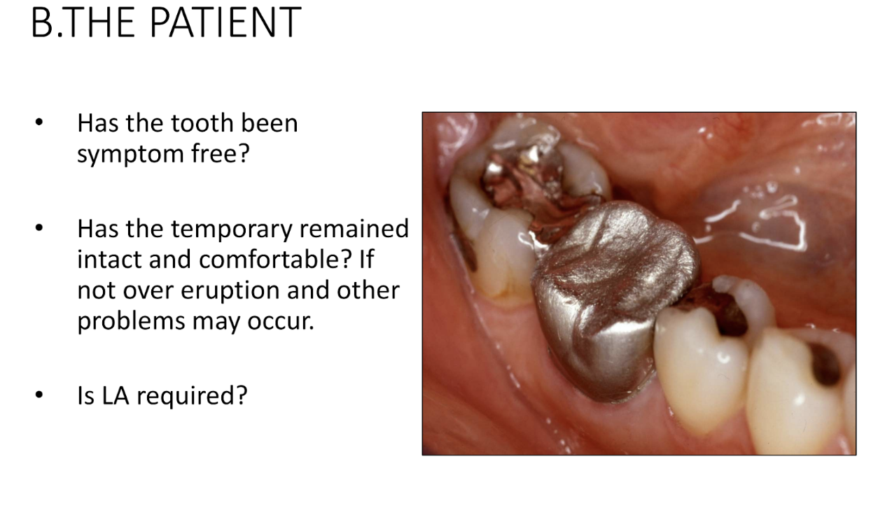 Confirm that the temporary restoration is intact and comfortable (if not, issues like overeruption may occur). π
