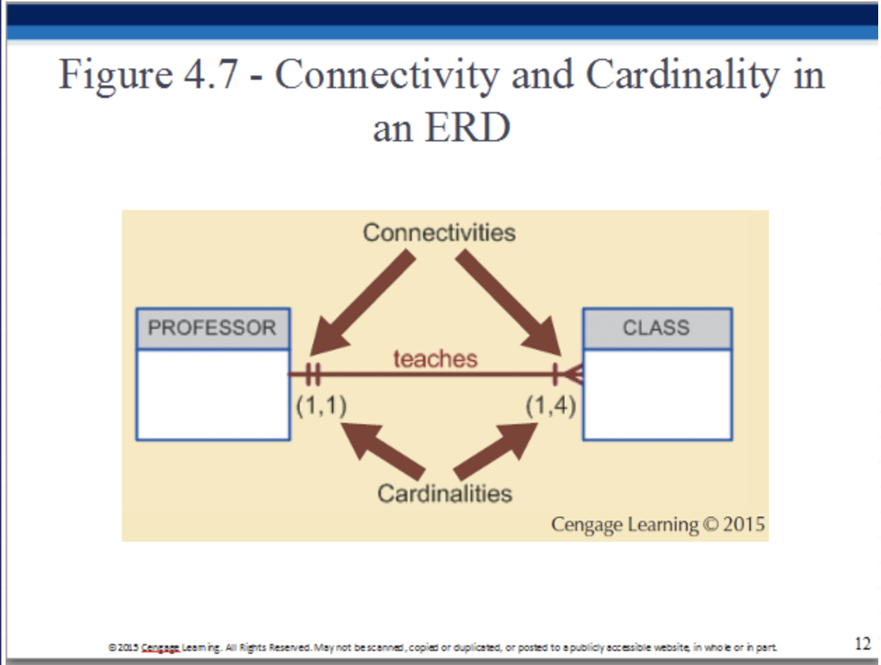 Connectivity: 1:1, 1:M or M:N (three diff ways by which two entities are related).