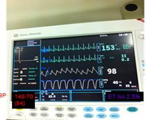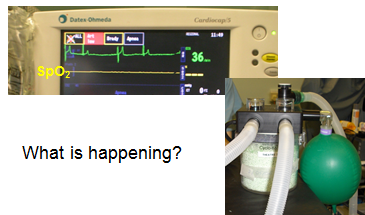 One hour into the procedure you see this: the oxygen saturation is 86% , which is too low.