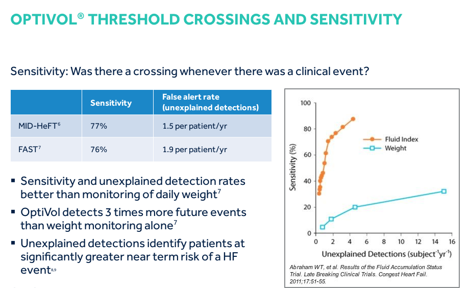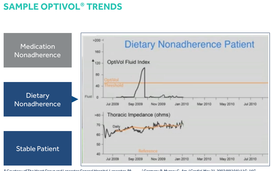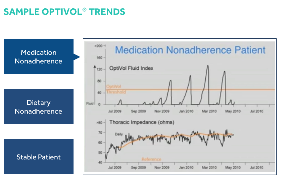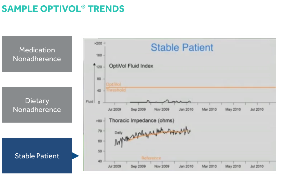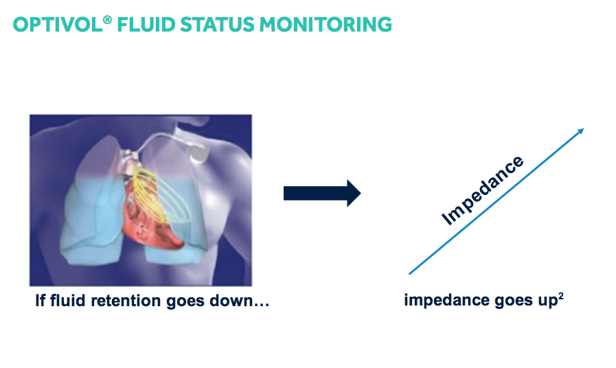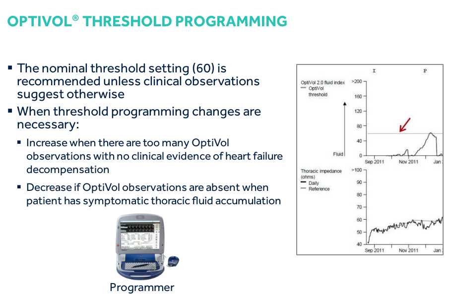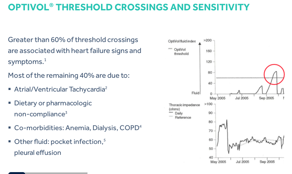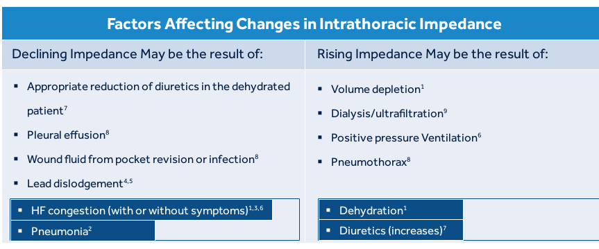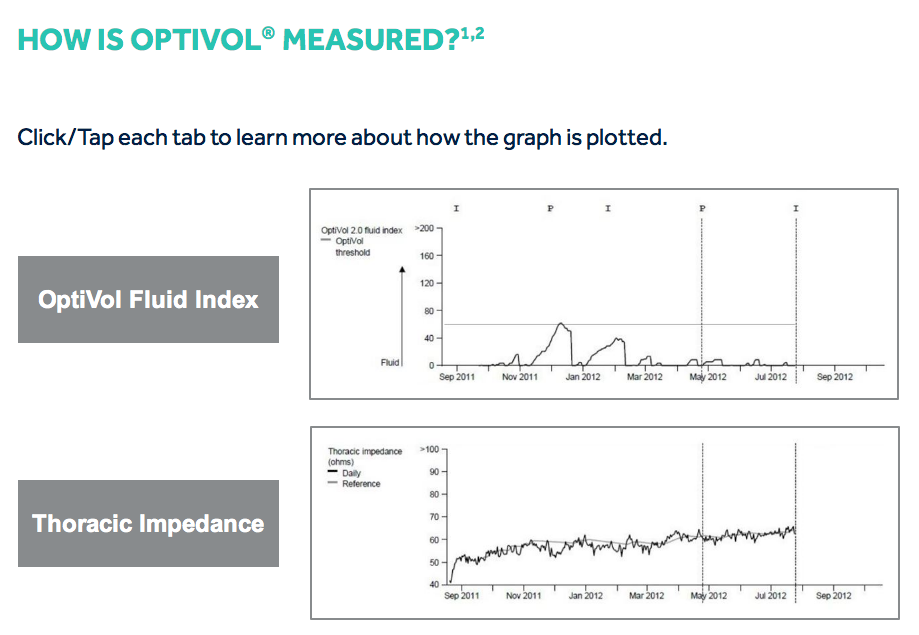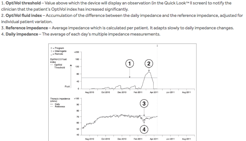 If the daily impedance falls below the reference impedance, this may indicate that fluid is accumulating in the patient’s thoracic cavity. If the daily impedance remains below the reference impedance, the difference between the daily impedance and reference impedance values, adjusted for individual patient variation, is added to the OptiVol fluid index. While there is a difference between the daily impedance and the reference impedance, the fluid index may continue to increase. If the daily impedance begins to rise, this may be an indication that the thoracic fluid accumulation is resolving and the fluid index may decrease. When the daily impedance returns to the reference impedance, the fluid event is considered to have ended and the OptiVol fluid index resets to 0.