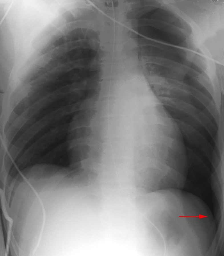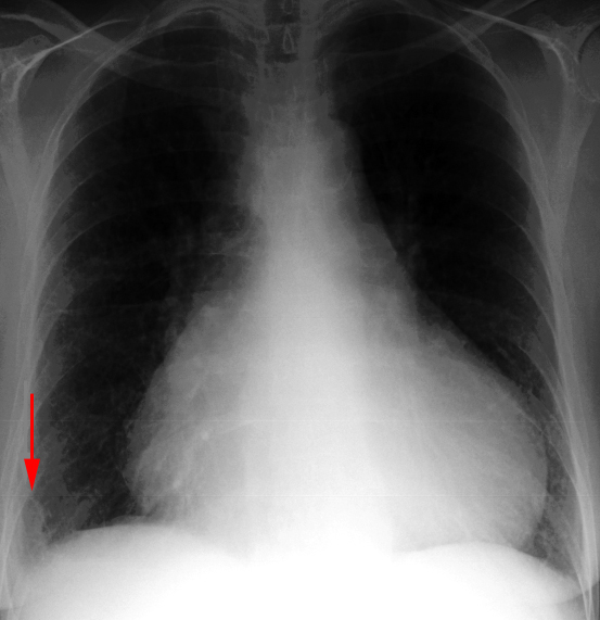 In the supine patient, intrapleural air rises anteriorly and medially, often making the diagnosis of pneumothorax difficult. The anteromedial and subpulmonary locations are the initial areas of air collection in the supine patient. An apical pneumothorax in a supine patient is a sign that a large volume of air is present. Subpulmonic pneumothorax occurs when air accumulates between the base of the lung and the diaphragm. Anterolateral air may increase the radiolucency at the costophrenic sulcus. This is called the deep sulcus sign. Other signs of subpulmonic pneumothorax include a hyperlucent upper quadrant with visualization of the superior surface of the diaphragm and visualization of the inferior vena cava.