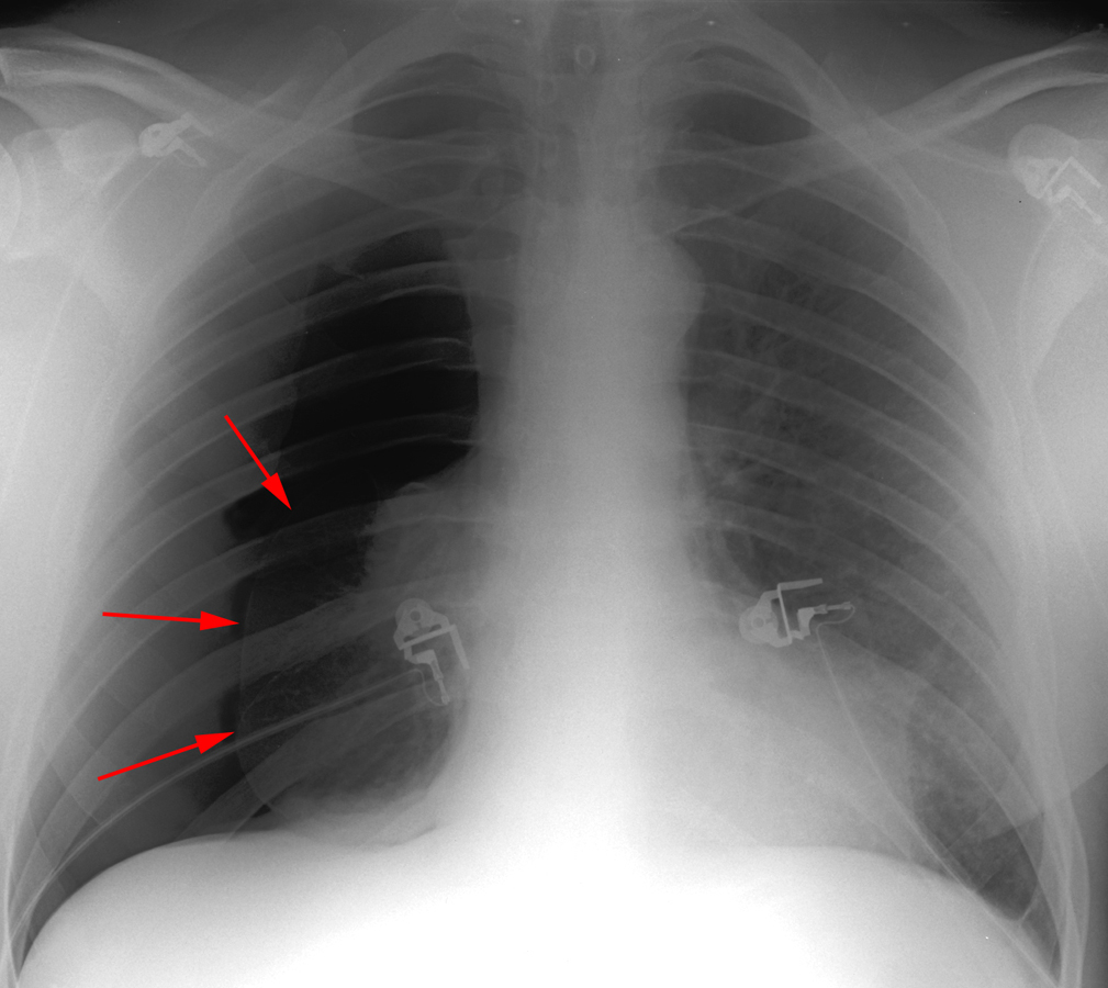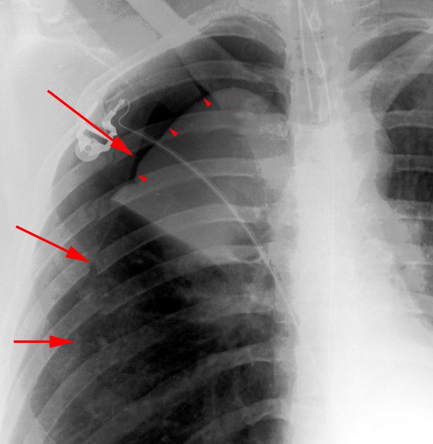 Some causes of spontaneous PTX are; idiopathic, asthma, COPD, pulmonary infection, neoplasm, Marfan’s syndrome, and smoking cocaine. However, most pneumothoraces are iatrogenic and caused by a physician during surgery or central line placement. Trauma, such as a motor vehicle accident is another important cause. Pneumothorax is a common complication of invasive procedures such as central line placement, especially in the mechanically ventilated patient. Barotrauma also can lead to pneumothorax, complicating the intubated patient’s medical course. The air may also arrive at the intrapleural space by rupture of alveoli (blebs), extension of a pneumomediastinum, or communication with extrathoracic air following trauma or surgery.