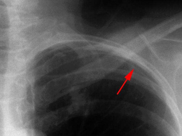 Lucency (pneumothorax), cavity, or abnormal shadowing (companion shadow of the second rib)