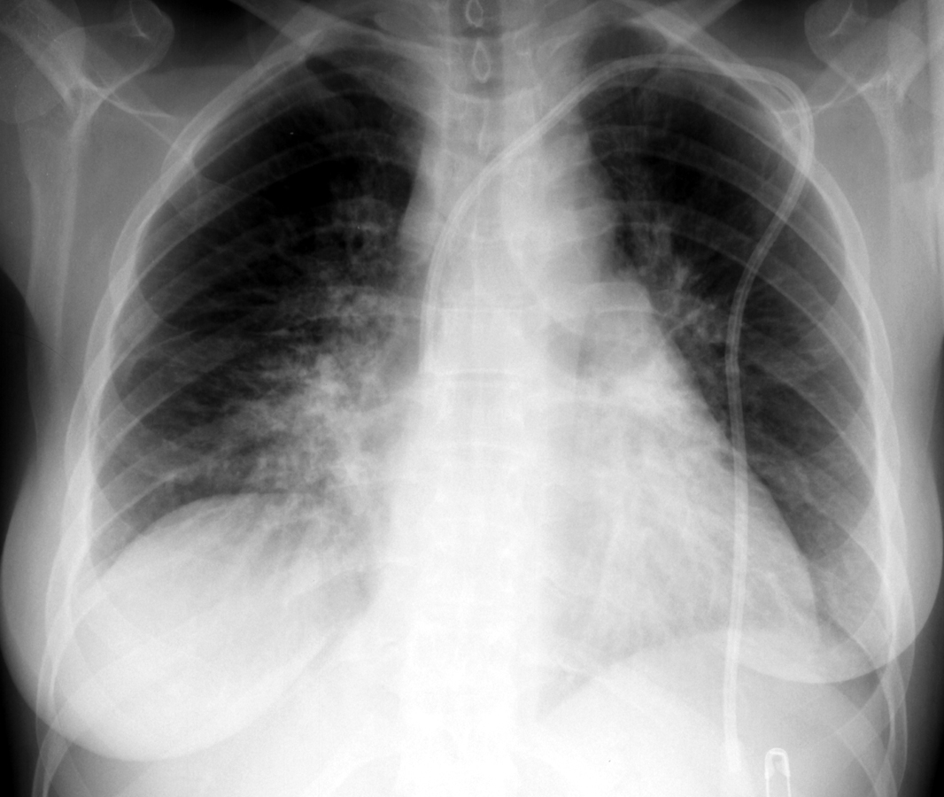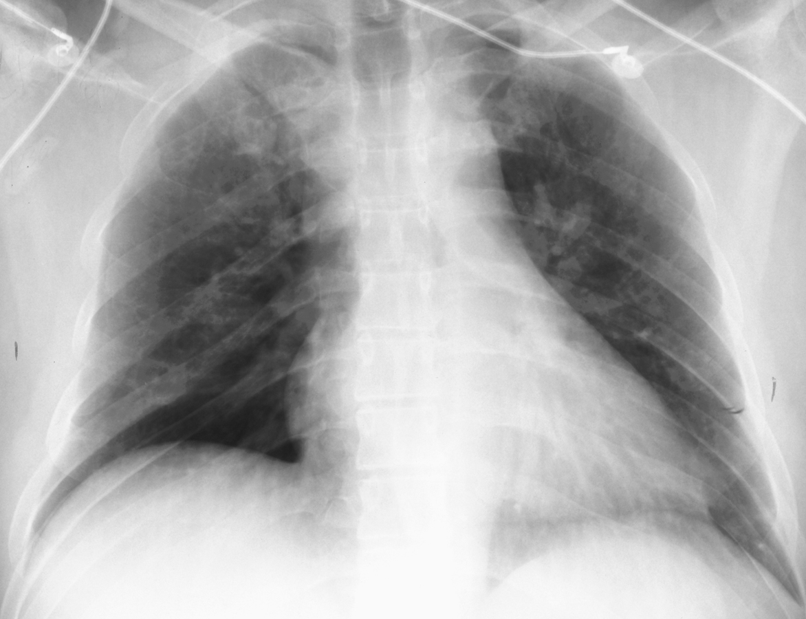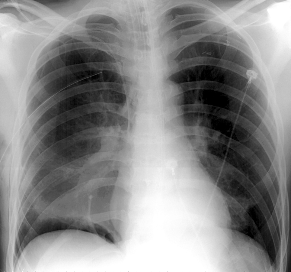 Nosocomial pneumonias by definition occur 3 days after admission. They differ from community-acquired pneumonias in both etiology and prognosis. Patients in the ICU are often relatively immunocompromised secondary to their primary disease and are subject to iatrogenic factors which increase their sucseptabilty to pneumonia-causing pathogens. These include the following: endotracheal tubes, which defeat many patient defense mechanisms; medications used to reduce gastric acid, which may promote bacterial growth in the stomach; and the use of antibiotics, which may selectively encourage the growth of some pathogenic bacteria. Nosocomial pneumonia presents a great concern for the intensivist and is the leading cause of infectious death in hospitals. Unlike community-acquired pneumonias, which usually are caused by gram-positive species, nosocomial pneumonias are often polymicrobial and caused by gram-negative enteric pathogens. The offending organisms often include Pseudomonas species, E-coli, Klebsiella species, and Proteus species. Traditional clinical indicators of pneumonia, including fever, elevated white blood cell count, and positive sputum cultures are often masked by severe underlying disease. The chest film must be correlated with clinical data in order to make the diagnosis of pneumonia in the ICU patient.