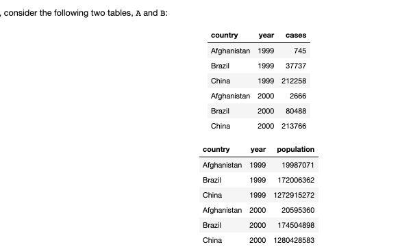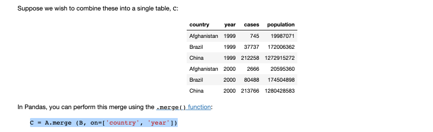 To use the merge operation on the following to tables labeled A & B, what would be the outcome of the following pandas merge command?