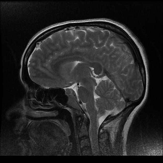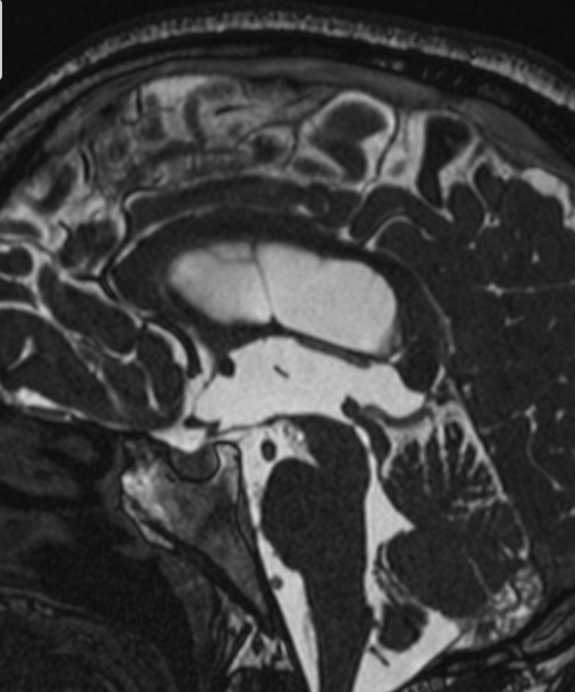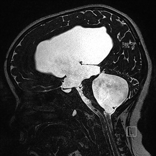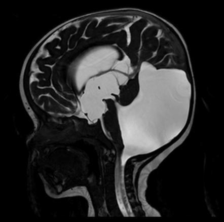 Marked obstructive hydrocephalus due to fourth ventricular outlet obstruction by fine septations