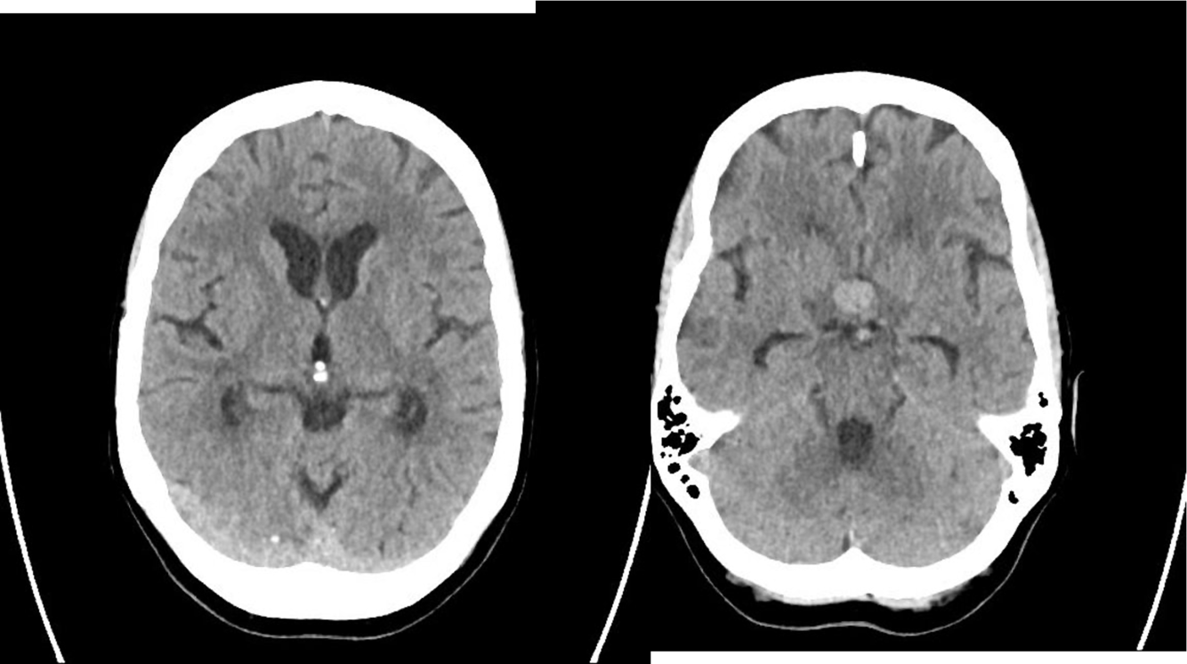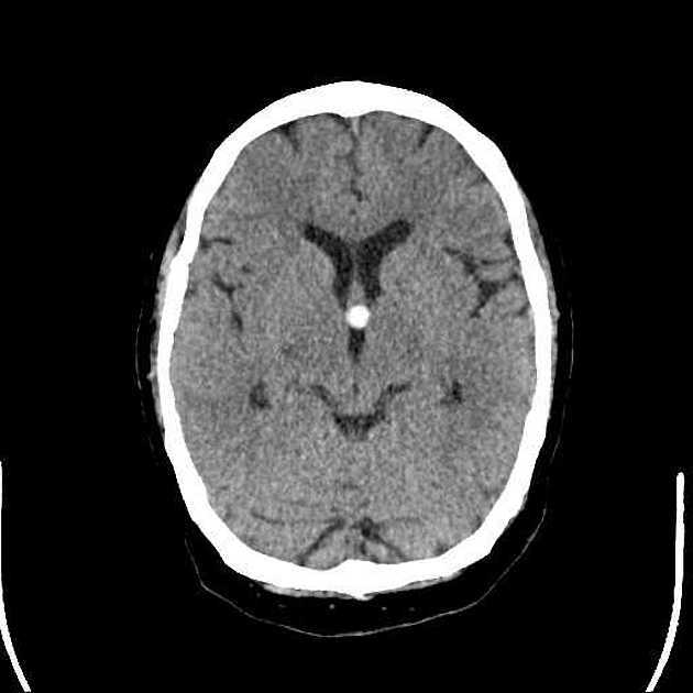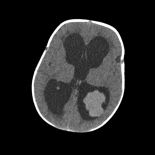 A lobulated hyperdense soft tissue mass with a “cauliflower-like” appearance in the trigone of the left lateral ventricle with intense contrast enhancement. The ventricular system is enlarged.