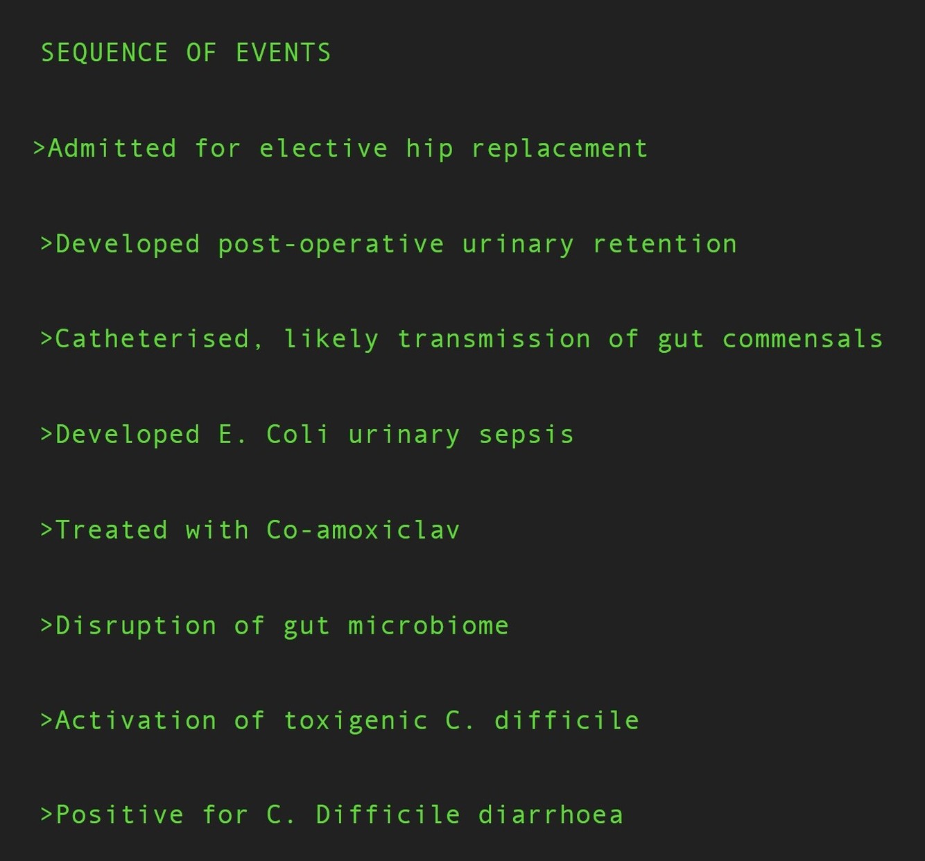 Why did Mr Rhatchett develop a C. difficile infection following treatment with co-amoxiclav?