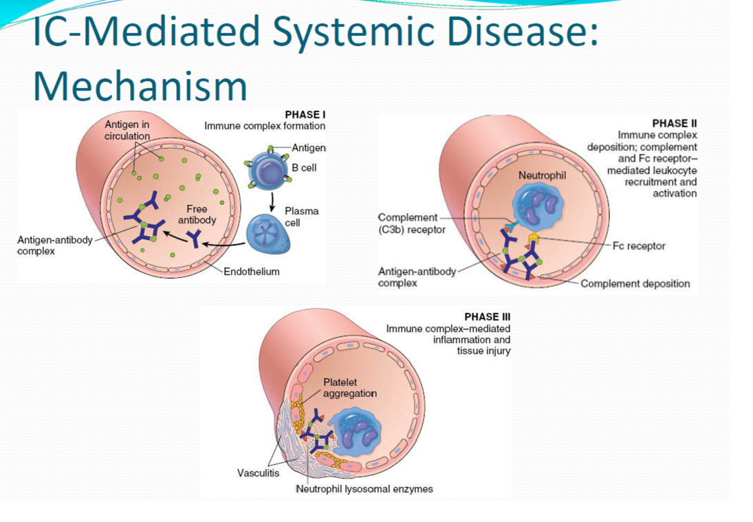 Type 3 delayed immune complex hypersensitivity response within 7+ days (adaptive immune response against foreign antigen)