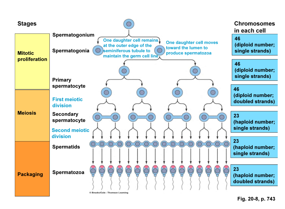 Spermatogonium –> primary spermatocyte –> secondary spermatocyte –> spermatid –> spermatozoa