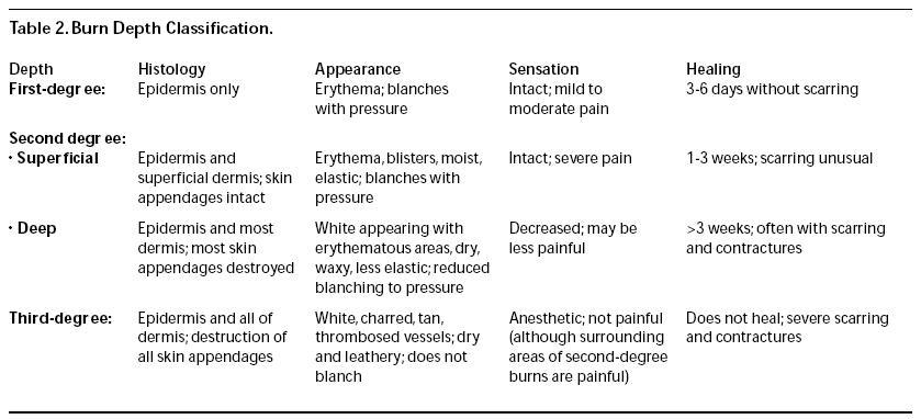 What are the differences between superficial, partial-thickness (2nd degree) and full-thickness (3rd-degree) burns in terms of: