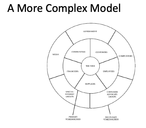 We look at the more complex model of stakeholder theory; where: