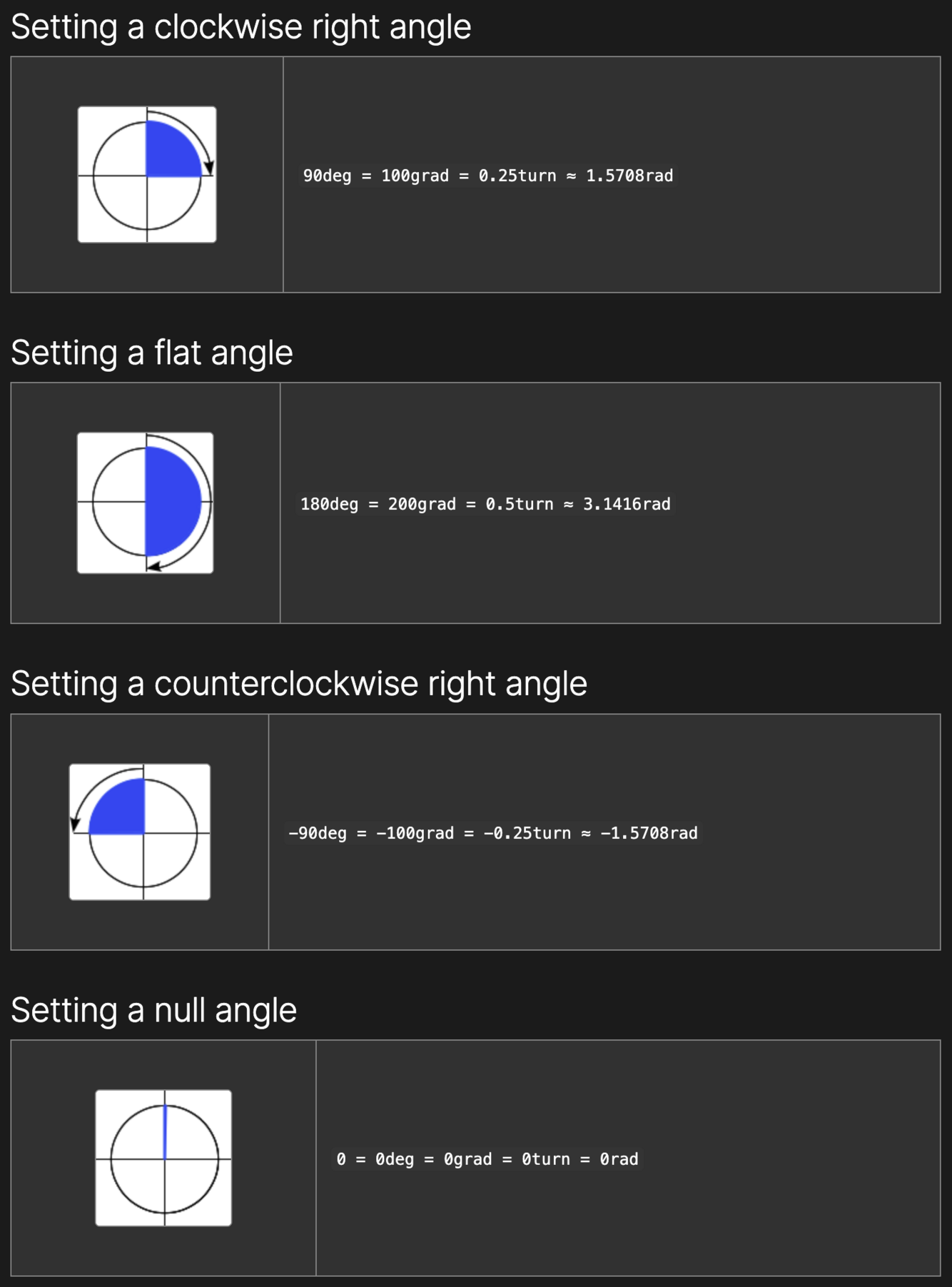 deg - Represents an angle in degrees. One full circle is 360deg. Examples: 0deg, 90deg, 14.23deg.grad - Represents an angle in gradians. One full circle is 400grad. Examples: 0grad, 100grad, 38.8grad.rad - Represents an angle in radians. One full circle is 2π radians which approximates to 6.2832rad. 1rad is 180/π degrees. Examples: 0rad, 1.0708rad, 6.2832rad.turn - Represents an angle in a number of turns. One full circle is 1turn. Examples: 0turn, 0.25turn, 1.2turn.”<angle> - CSS: Cascading Style Sheets | MDN” (MDN Web Docs). Retrieved April 3, 2024.
