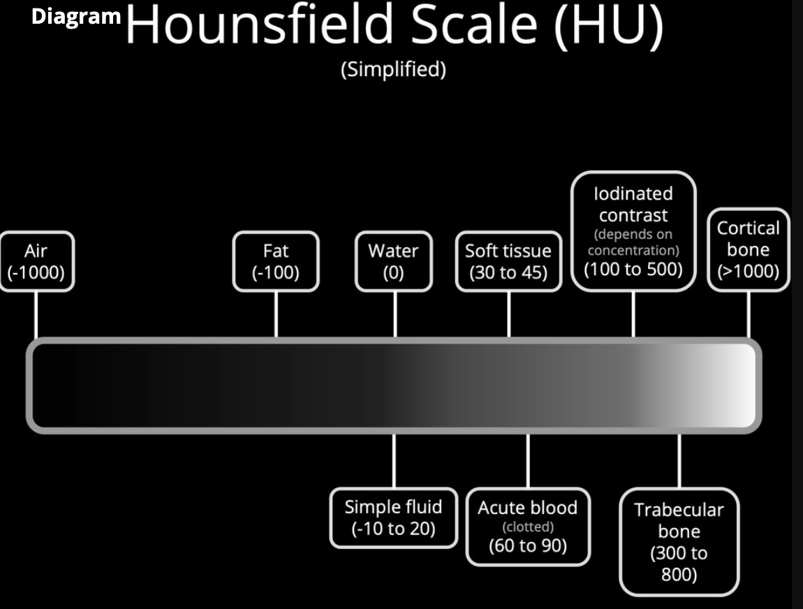 Describe the HU scale: air, fluid, water, fat, ST, contrast, bone