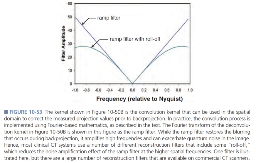 Ramp filter = same as deconvolution kernel, but as plotted in FREQ DOMAIN (see shape in pic). Requires roll off, because inherently amplified high freq signal -> small objects with predominance of quantum noise! Thus roll-off controls noise.