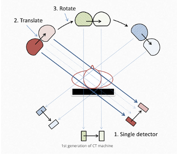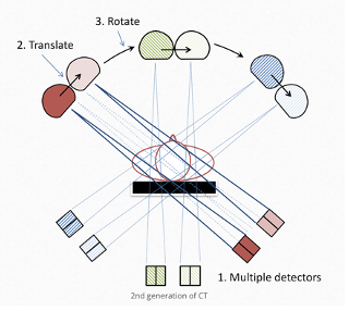 3. This is repeated until a single slice is scanned then the array is moved to a different slice (axial scanning). Alternatively, the detector array is continually moved down the patient as it rotates (spiral scanning), This is the most commonly used method today and takes about 0.3 seconds to image a single slice