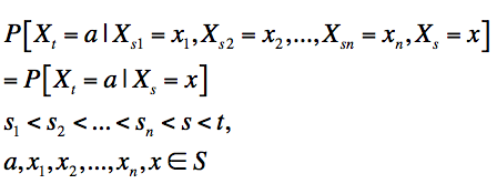 If a stochastic process Xt is defined on a state space S and time set t ≥ 0, the Markov property is expressed mathematically as: