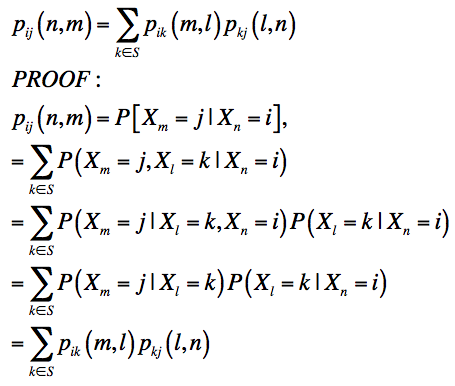 The Chapman-Kolmogorov Equations provide a way of calculating n-step transition probabilities through matrix multiplication of single-step transitions. The proof is as follows: