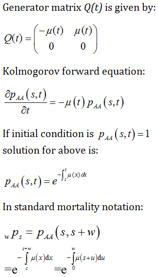 The survival model is a two state Markov chain, with a state space of S = { A, D } (alive / dead). There is single transition rate μ(t) - identified with the force of mortality at age t