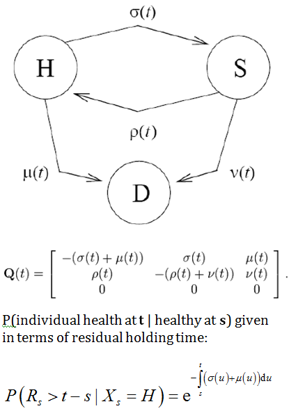 An extension of the survival model, with three states - healthy (H), sick (S) or dead (D). S = { H, S, D }
