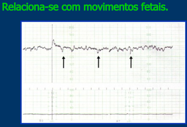 Diminuição abrupta da FCF abaixo da linha de base, variáveis (V,U,W). Rápido retorno a linha de base. Bradicardia reflexa a hipertensão fetal em resposta a a contração uterina.