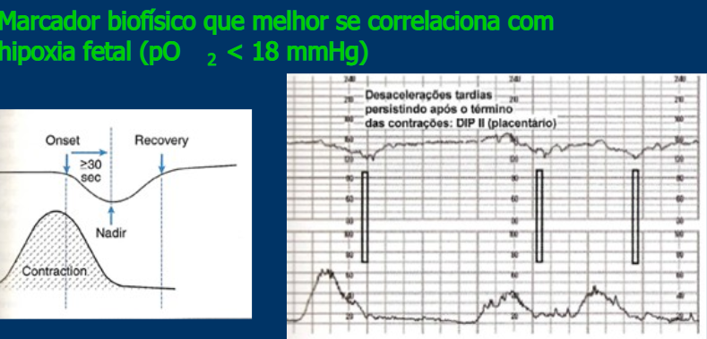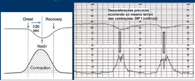 ↓FCF = ↑contração uterina → compressão cefálica→baroreceptor temporal→resposta vagal. O nadir da desaceleração coincide com o pico da contração uterina Ocorrem durante trabalho de parto, gestação oligodramnia.