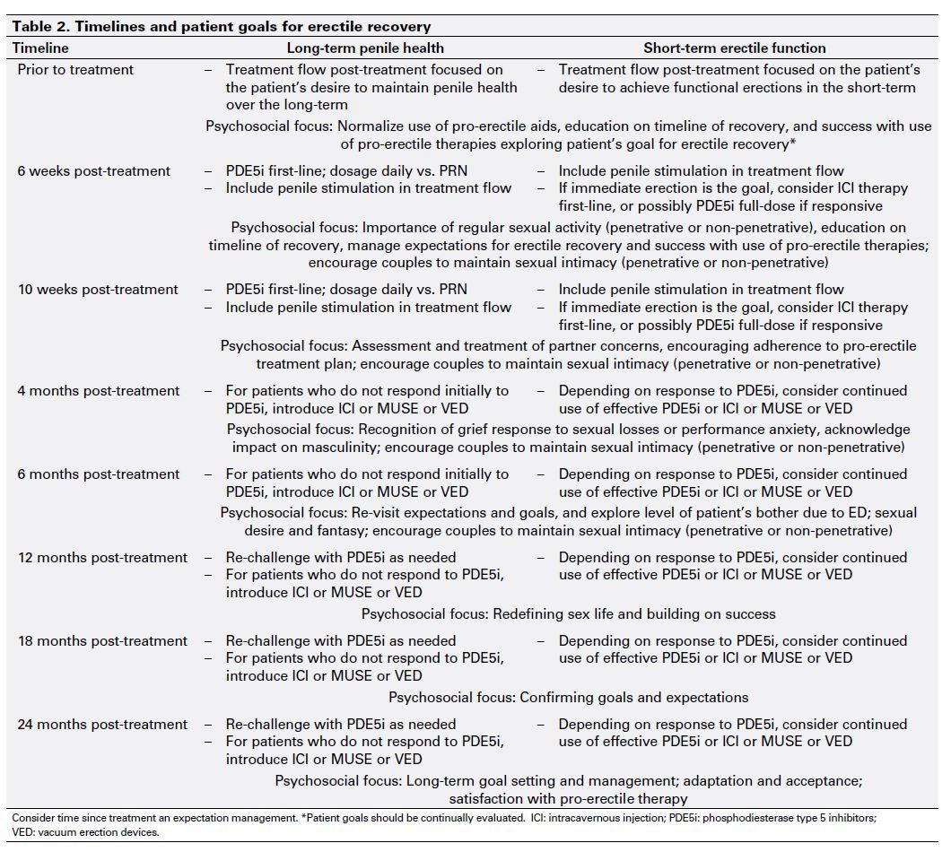 While the best time to introduce erectile rehabilitation remains unclear, pre-PCa treatment psychoeducation on sexual dysfunction and available ED therapies is………